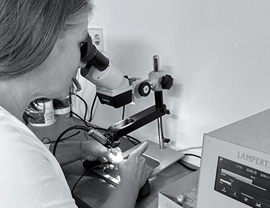 Seit 2002 benutzen wir das erste Modell der Lampert Feinschweißgeräte. Der PUK 111 ist ein großartiges Schweißgerät, auf das wir uns in unserer Schmuckfabrik verlassen können. Fast täglich arbeiten bei uns damit mindestens 10 Goldschmiede.
